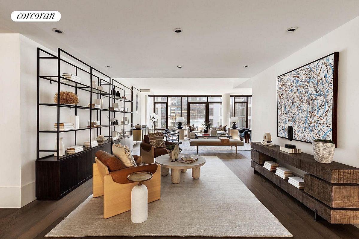 Step into an expansive great room that feels both intimate and infinite - framed by striking floor-to-ceiling gunmetal windows and graced with Northern and Southern exposures. Wide-plank oak floors lend warmth underfoot, setting the stage for unforgettable evenings and relaxed, soulful living.