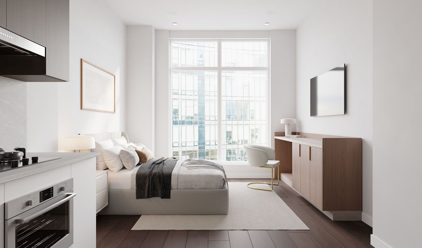 Discover luxury living in this stunning Long Island City apartment, thoughtfully designed for comfort and style. The home features a full-size kitchen and a spa-inspired bathroom, offering an oasis of relaxation with a luxurious bathtub. Located in the heart of Long Island City, this apartment provides easy access to Manhattan and a vibrant neighborhood filled with dining, shopping, and entertainment. Designed by celebrated architect Ismael Leyva, this residence combines sophisticated interiors with smart home technology for the modern urban lifestyle. Inside, enjoy open-concept layouts with soaring 10- to 11-foot ceilings, natural light, and refined finishes. The chef’s kitchen boasts high-end appliances, a gas range, and exquisite Taj Mahal quartzite countertops, while the bathroom offers radiant heated floors and premium fixtures. Additional touches include dark walnut floors and in-unit washer/dryer. Residents also have access to exclusive amenities, including private terraces, a fitness center, package room, Amazon locker hub, kids’ playroom, and pet spa. - Soaring Ceilings: 10' to 11'1" - Transit Options: E, M, R, W, G, F, and 7 trains