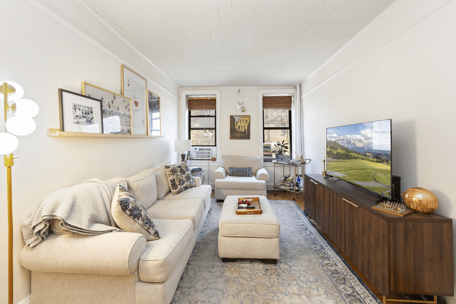 Welcome to this beautifully renovated, oversized 1-bedroom apartment located on the elevated first floor of a well-maintained, elevator co-op building in the heart of Sunnyside, on the north side of Queens Boulevard. Nestled in the rear of the building with windows facing a quiet courtyard, this oasis is a rare find in Queens, offering comfort, convenience, and space.