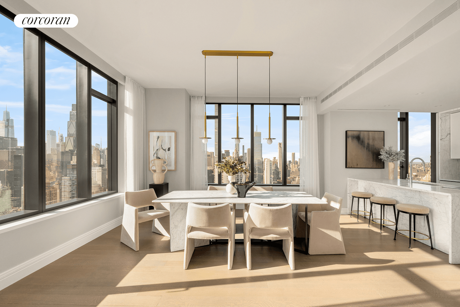 56B is a three-bedroom, three-and-a-half-bathroom residence featuring 2,116 square feet of interior space. The dramatic entry gallery leads to a gracious living and dining area that offers southwestern exposure and floor-to-ceiling windows. An open kitchen offers Statuarietto marble countertops and Italian custom-crafted matte lacquer white cabinetry adorned with Sub-Zero and Wolf appliances.