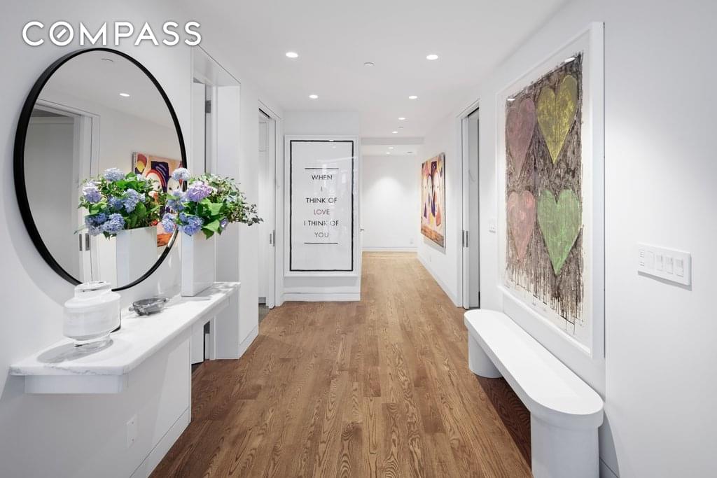 Additional details include brand-new hardwood walnut floors throughout, custom hand-painted plaster wall treatments in the elevator landing, powder room and primary bedroom.
