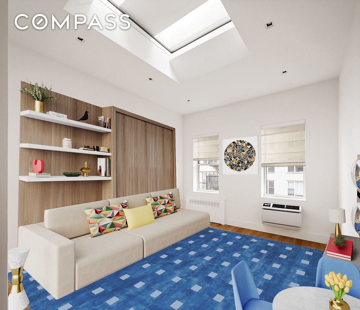 On the top floor of the building, Residence 4P is a beautifully renovated south-facing oversized studio home that has been completely rebuilt to a high end condo standard and features 11'8" ceilings and two prominent skylights.
