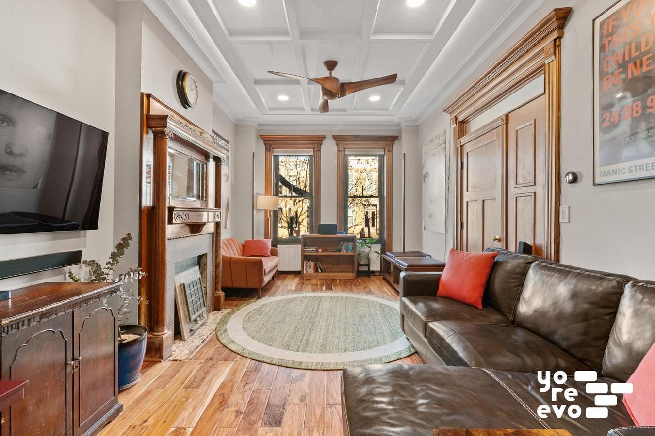 The parlor level boasts 10-foot ceilings, an open kitchen that flows into the living and dining areas, and direct access to a spacious backyard complete with a convenient storage shed. Thoughtful renovations throughout the home showcase original details, including exposed brick, intricate millwork, and a pocket door that separates the kitchen from the living room.