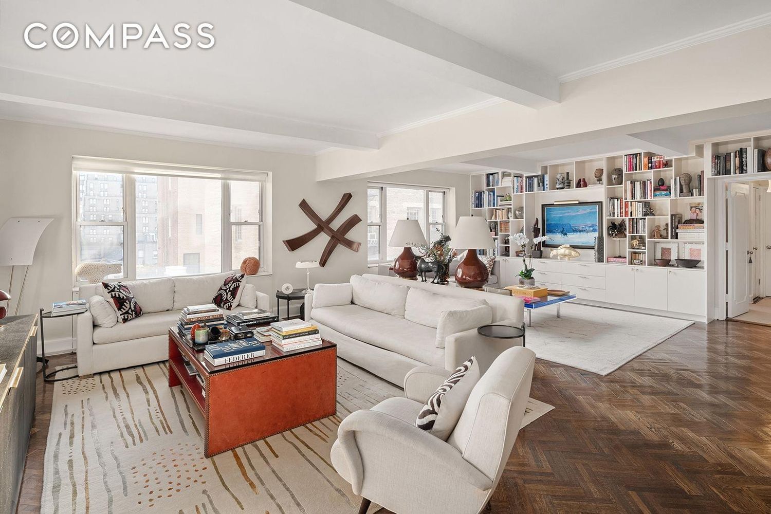 Step into this spacious and inviting condominium apartment featuring a grand double-sized living room with open southern sky views and large expansive windows that flood the space with natural light. The living room offers flexible options for formal or informal dining, making it perfect for entertaining. The 9-foot beamed ceilings and oak herringbone floors add great elegance to the space.