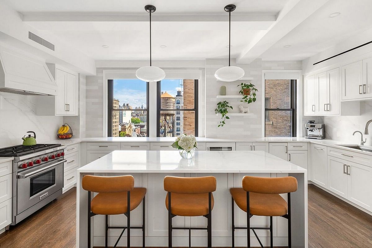 The expansive living area spans an impressive 46 feet wall-to-wall and is filled with natural light from 13 oversized east- and west-facing windows. The chef's kitchen is designed for both daily living and entertaining, featuring a 7-foot island, 6-burner Wolf gas range, 42" Sub-Zero refrigerator, additional 30" Wolf electric oven, wine fridge, large pantry, and custom built-in cabinetry.
