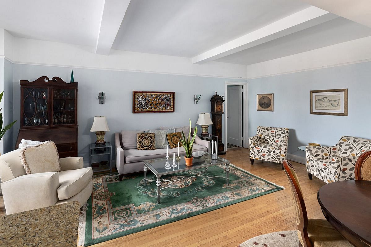 This charming prewar apartment features generous room sizes, oak floors, high beamed ceilings, and six closets. The entry has two closets and opens to a fully equipped windowed kitchen with a wall oven, cooktop, dishwasher, plenty of storage, and granite counter tops. The open north facing living room is large enough for both dining and living spaces. A hallway separates the bedrooms from the common spaces with a second bedroom facing north featuring a windowed en-suite bath with a jacuzzi tub and a washer/dryer. A second bath features a shower and is available to guests without having to go through a bedroom. The very generous primary bedroom faces south with magnificent park and south city skyline views, featuring two walk-in closets.