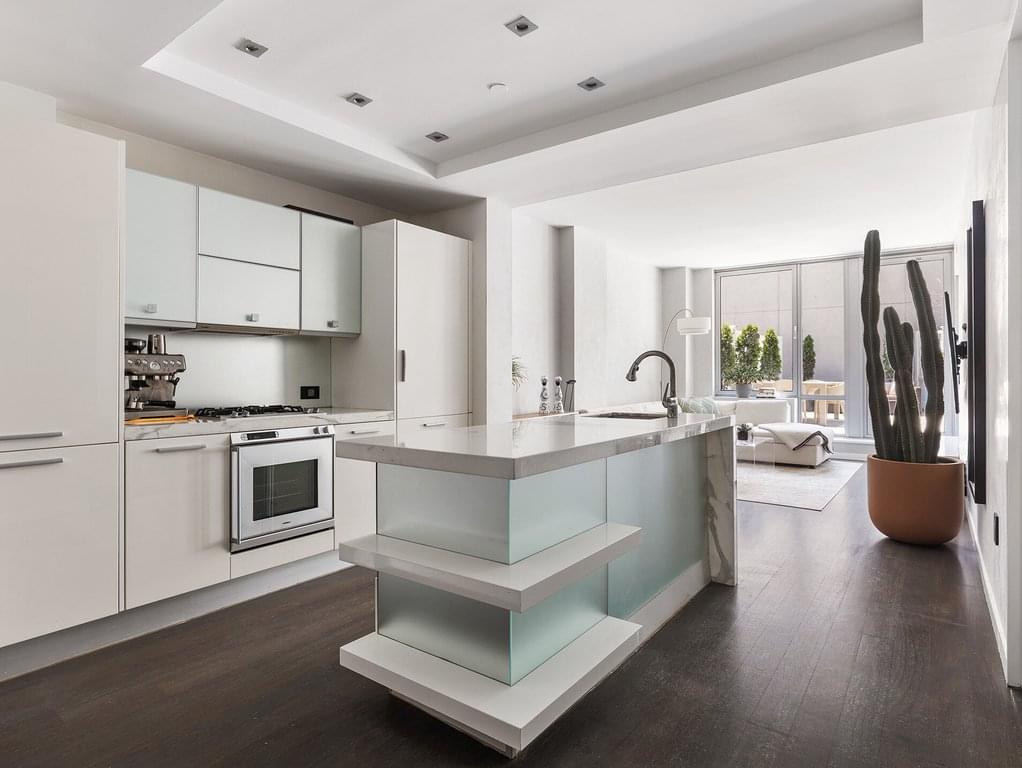 The exquisitely designed open kitchen is a highlight of this home, featuring GD Cucine Italian cabinets in high gloss white with quartz glass doors, a Gaggenau range & oven with an overhead vented hood, and a dishwasher. The Sub-zero refrigerator, Statuario marble slab counters, and Grohe fixtures all work together to create a crisp, clean, and modern look. The kitchen also comes complete with a freestanding island with an overhang for bar stools.