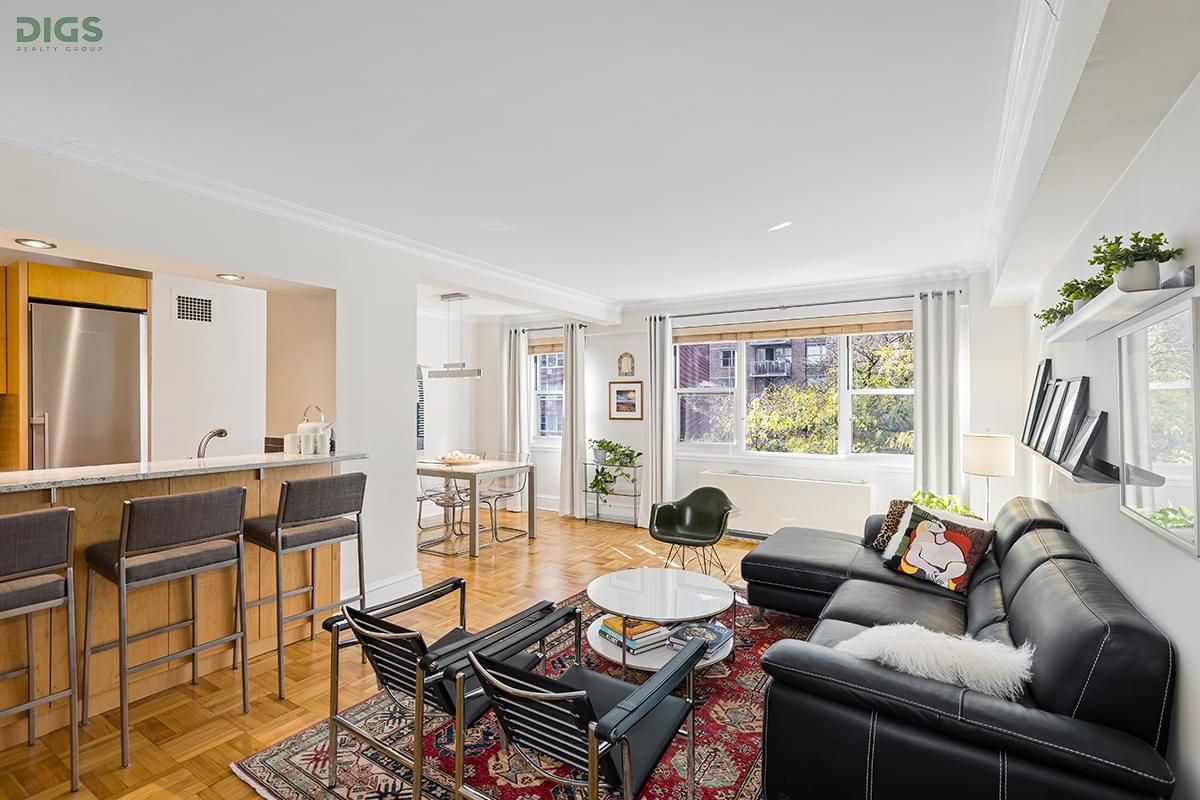 As you enter this gracious home, you step into a foyer that features the first of the apartment's four large custom-outfitted closets. The living room is spacious and bright, with southern light streaming through the wall of south-facing windows opening to treetop views. There is a separate dining area perfect for relaxing and entertaining. The renovated open kitchen boasts granite countertops, recessed lighting, and high-end stainless appliances, including a Bertazzoni range, a Liebherr fridge, and a Bosch dishwasher. The kitchen has ample storage, including a walk-in pantry and clever cabinets under the breakfast bar.
