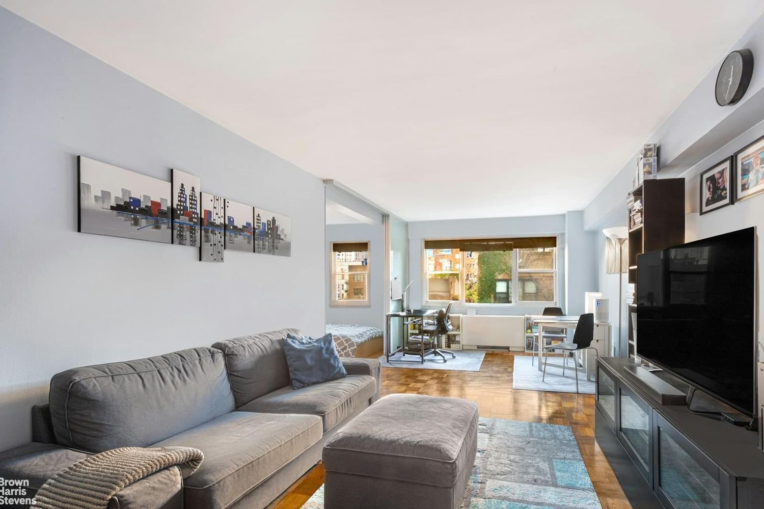 Here is a charming over-sized junior 1 bedroom (approx 600 sq ft) for an incredible value in a full service Coop building. From the oversized foyer with two large closets, you'll fall in love with the spacious living area and the wide expanse of north-facing windows. The main living space provides a generous layout for seating, dining and home office areas. The impressive sized kitchen awaits your personal touches. Originally an alcove studio has glass sliding doors to create a bedroom big enough for a queen size bed that includes abundant closet space & a dressing area.