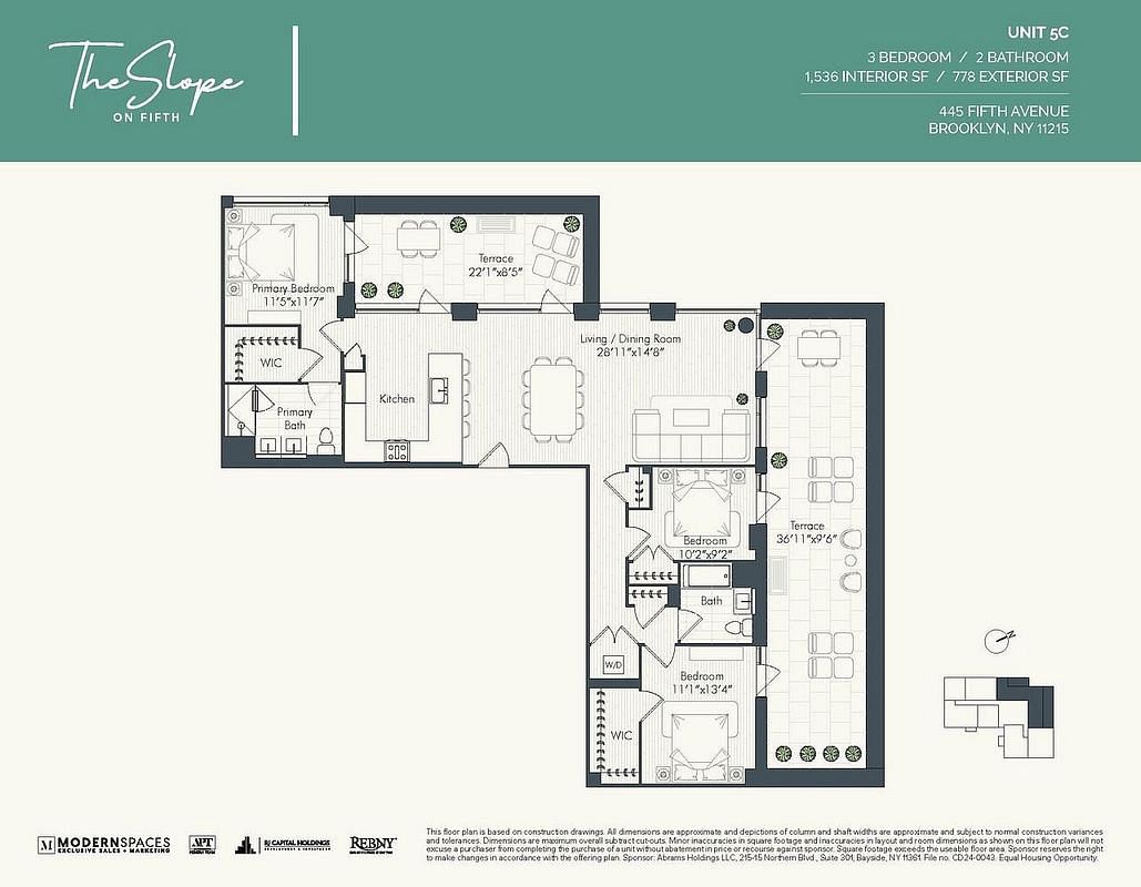 Welcome to Residence 5C at The Slope on Fifth, a stunning three-bedroom, two-bathroom condominium with outdoor space that offers an unparalleled living experience in the iconic Park Slope, Brooklyn. Enter this exquisite residence that blends modern elegance with contemporary Scandinavian influences. Exquisite PID engineered hardwood flooring in a European white oak finish sets the tone, while floor-to-ceiling windows flood the space with abundant natural light.