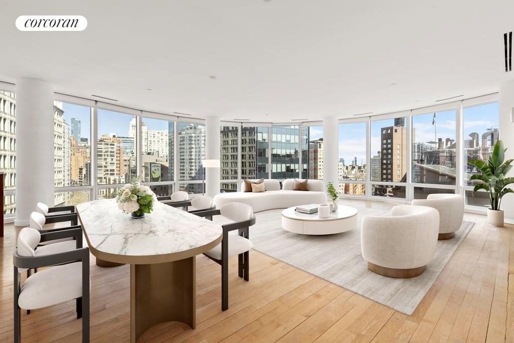 Residence #9A features approximately 2,248 sqft, upon entering the spacious foyer, you are immediately drawn to the distinctive layout that makes this building so desirable. The large windows encompass the living and dining rooms, which allows residents to enjoy panoramic views of the city and skyline from their homes. The separate dining area perfectly accommodates a large dining table. The full-size kitchen extends north with Wolf appliances, a four-burner range, and a separate wine fridge.