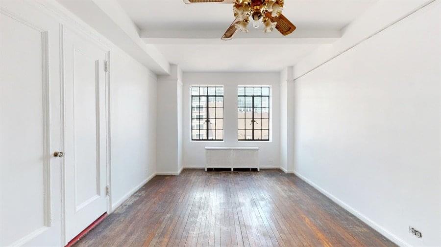 An entryway leads into a spacious studio with ample room for distinctive living and sleeping areas. The single-line recessed kitchenette is discreetly concealed behind a pair of doors and can be easily upgraded with new finishes and appliances. The bathroom has a deep tub and pedestal sink.