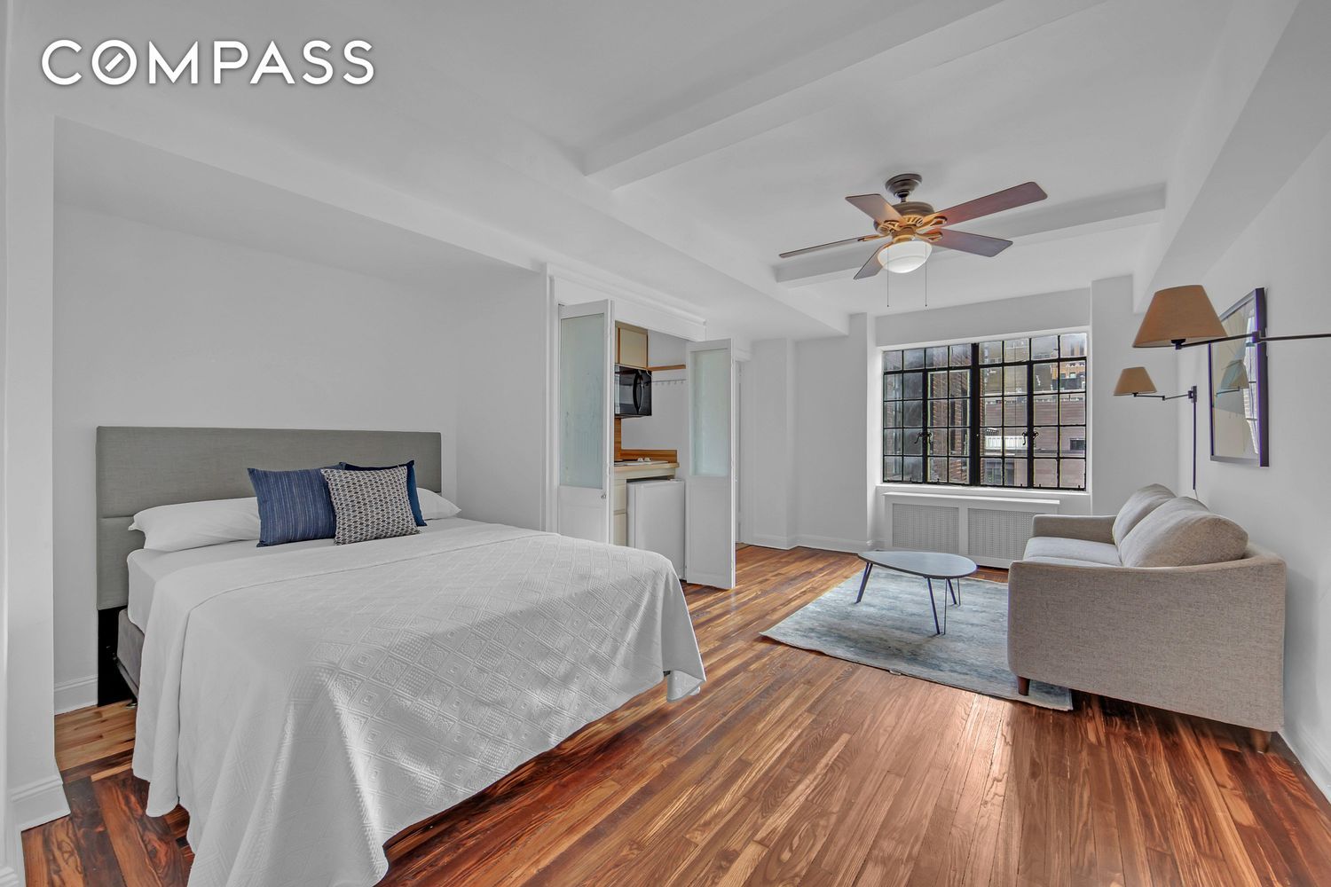 16th-floor studio for sale at Prospect Tower. This apartment features western exposure overlooking Tudor City Park with Chrysler Building views. The apartment contains a kitchenette with dishwasher, mini fridge, two burner cooktop and microwave oven. There are two closets and hardwood floors throughout. The bathroom is tiled.