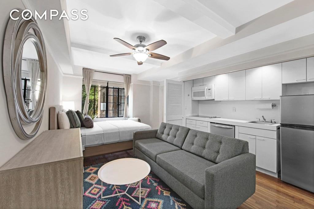 Studio apartment with western exposure overlooking Tudor City Park. The unit features an updated kitchen including a full-size stainless steel dishwasher, 4 burner electric cooktop, full-size refrigerator & built-in microwave. There are hardwood floors and 3 closets for optimal storage space. The bathroom features white tiles throughout and a pedestal sink. Maintenance includes heat, water & electricity; cats are allowed.