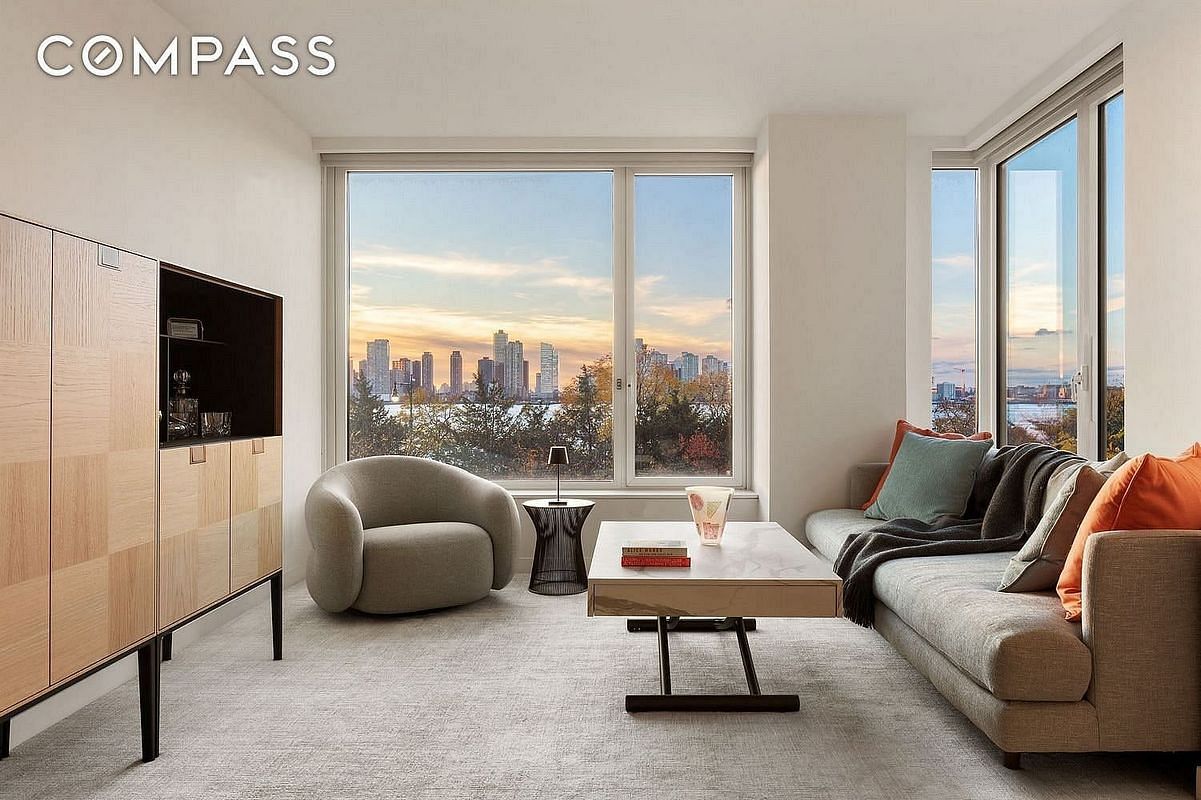 Designed by Roger Ferris + Partners and developed by Related Companies, the home showcases 7-inch-wide white oak plank flooring, bronze-finished windows with Caesarstone ledges, and an open-concept kitchen appointed with Miele appliances, warm-toned quartzite countertops, matte white lacquer cabinetry, and Dornbracht fixtures. Bathrooms feature European White Oak vanities, Calacatta Lincoln marble countertops, and Dornbracht fittings, creating a refined and cohesive design aesthetic throughout.