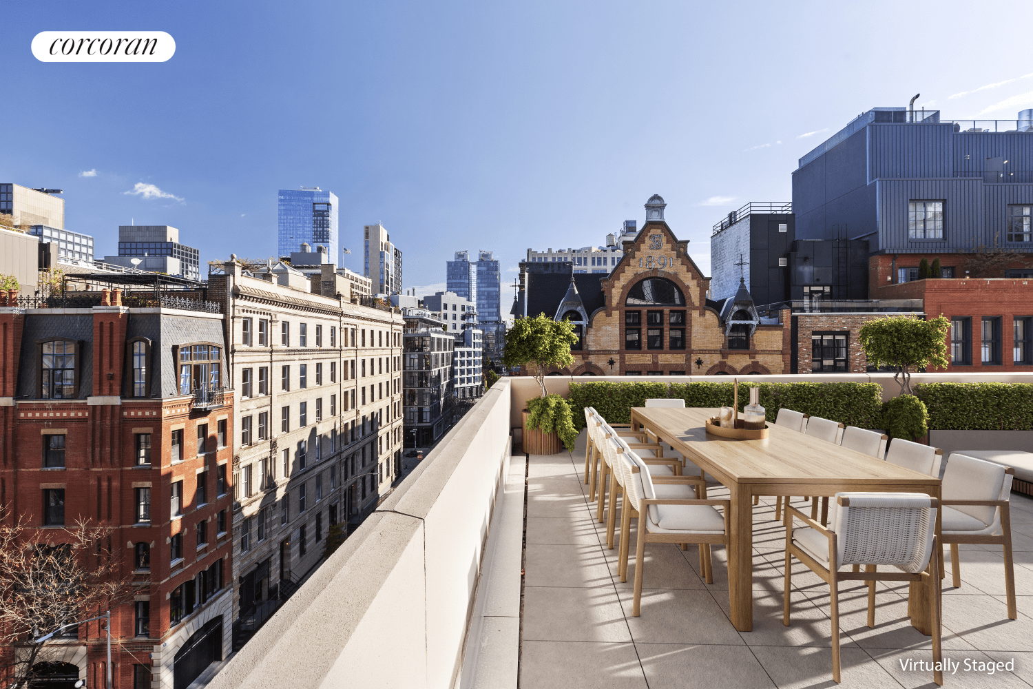 RESIDENCE 706 is a thoughtfully designed three-bedroom home featuring a remarkable 1,070-square-foot terrace. The layout includes a spacious double-corner great room, a separate kitchen/family room offering charming views of Historic Tribeca architecture, a home office, and partial water views.