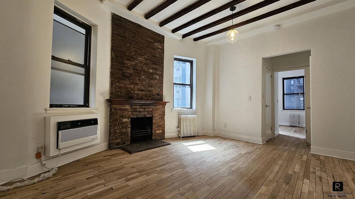 The charming and cozy 1BR 1Bath pre-war Co-op, 11ft high beamed ceilings with a wood burning fireplace exposed brick. There is stainless freezer and gas cooktop with updated kitchen and convenient granite counter. The bedroom accommodates a Queen sized bed, windowed bathroom is stylishly renovated with bright, contemporary with glass shower stall and a hall closet offers plenty of storage.