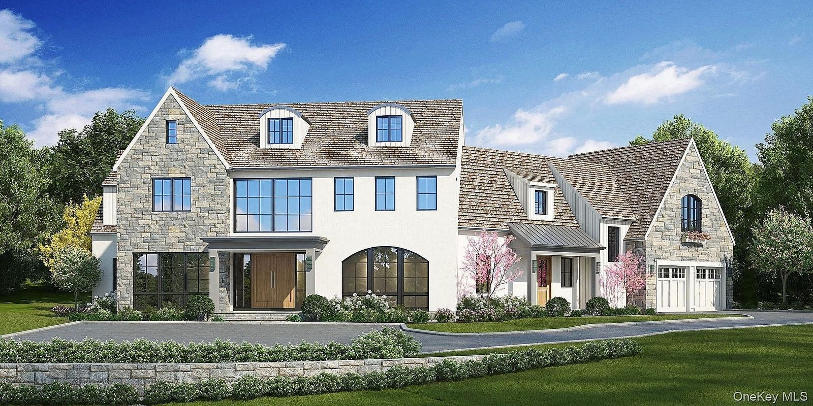Location, design, and exceptional craftsmanship converge at 460 Sterling Road, set within the prestigious Sterling Ridge neighborhood of Harrison. This California Colonial, thoughtfully designed and built by Georgio Home, exemplifies refined luxury. A striking exterior of rich stone, cement stucco, and vertical cedar plank siding is complemented by Marvin high-efficiency oversized windows, a cedar roof, a gracious front porch, and a covered rear veranda appointed with Chinese granite, phantom screens, and a wood-burning fireplace. Inside, a thoughtfully designed layout unfolds beginning with a dramatic two-story foyer featuring a sweeping curved staircase and chevron-patterned white oak flooring. The foyer is elegantly flanked by expansive living and dining rooms, where arched architectural details add timeless character throughout. The family room, enhanced by custom oak beams, flows seamlessly into the gourmet chef's kitchen and opens through two custom French doors to the covered veranda—creating an ideal setting for both everyday living and effortless entertaining. The first floor also includes two powder rooms, an oversized pantry, and a generously sized mudroom with convenient access to the garage, front porch, and rear grounds. Upstairs, the luxurious primary suite offers vaulted ceilings, two walk-in closets, and a spa-like en-suite bath with skylights. Four additional bedrooms each feature en-suite bathrooms and walk-in closets, while a fifth bedroom or office includes a sitting room and private en-suite. A second-floor laundry room completes this level. The lower level boasts an expansive recreation space, a sixth bedroom, and a full bathroom, offering additional flexibility for guests or extended living. All of this is set on over an acre of beautifully landscaped property, complete with an approved pool site. This is a rare and exceptional offering not to be missed!