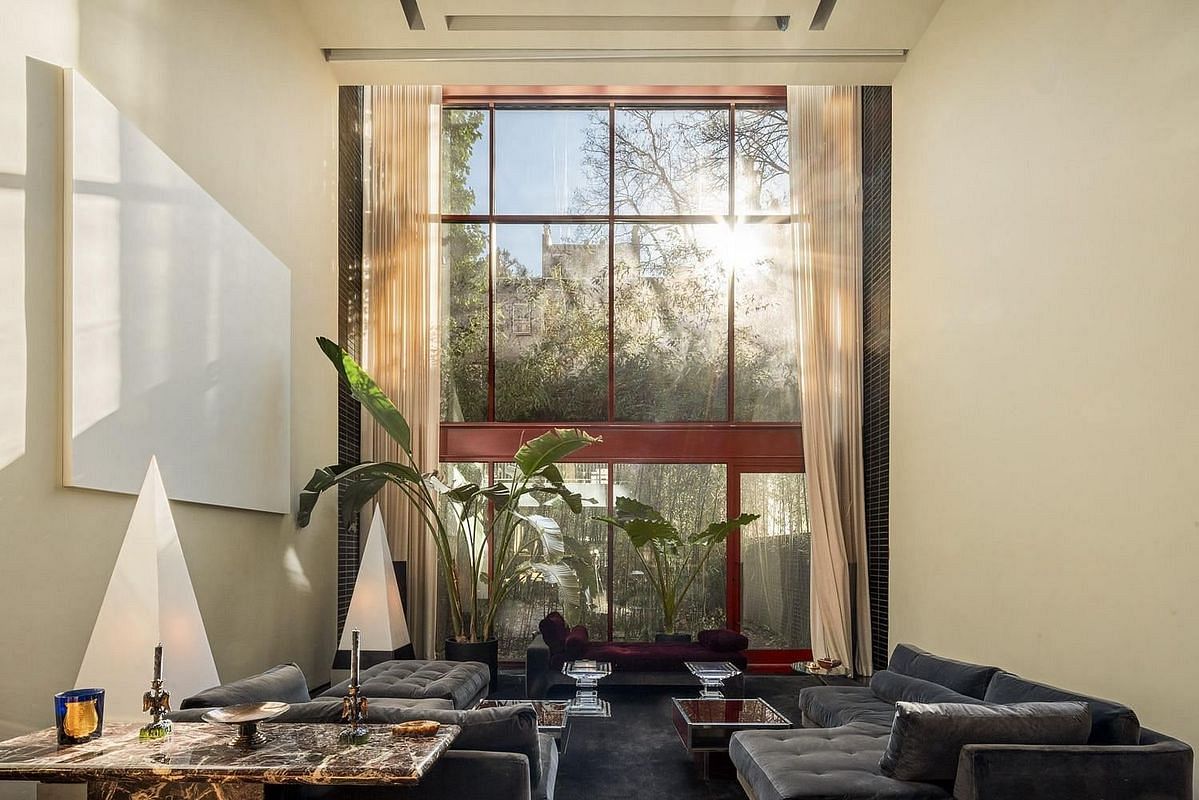 On the parlor level, a refined home office with 12-foot ceilings and a wood-burning fireplace sets the stage for focused work and quiet conversations-while an elegant dining lounge overlooks the dramatic double-height living room below. The chef's eat-in kitchen-anchored by custom brass sinks, emerald fluted tiles, and professional-grade appliances-naturally becomes the home's most irresistible gathering place. Just beyond, a richly atmospheric lounge with a striking green marble mantel and wood-burning fireplace opens to a planted terrace with an electric awning, designed for sunlit afternoons and effortless unwind.