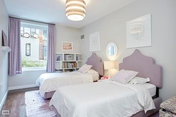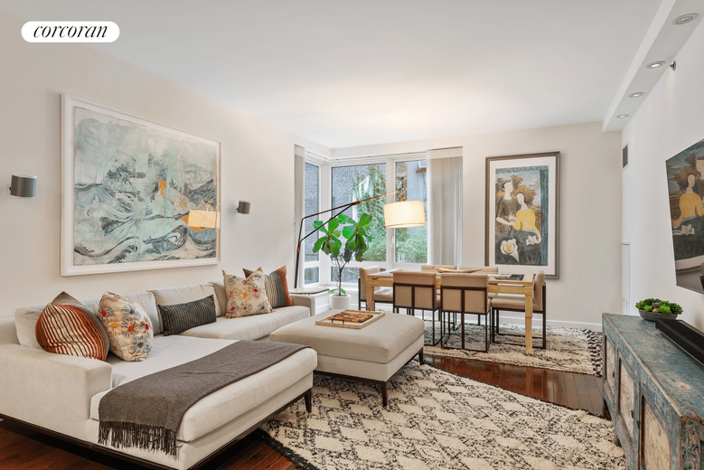 Other features include 9" high ceilings, beautiful high gloss hardwood floors throughout, 8 closets including that increasingly rare linen closet, central air-conditioning, large white framed windows, and motorized blinds.