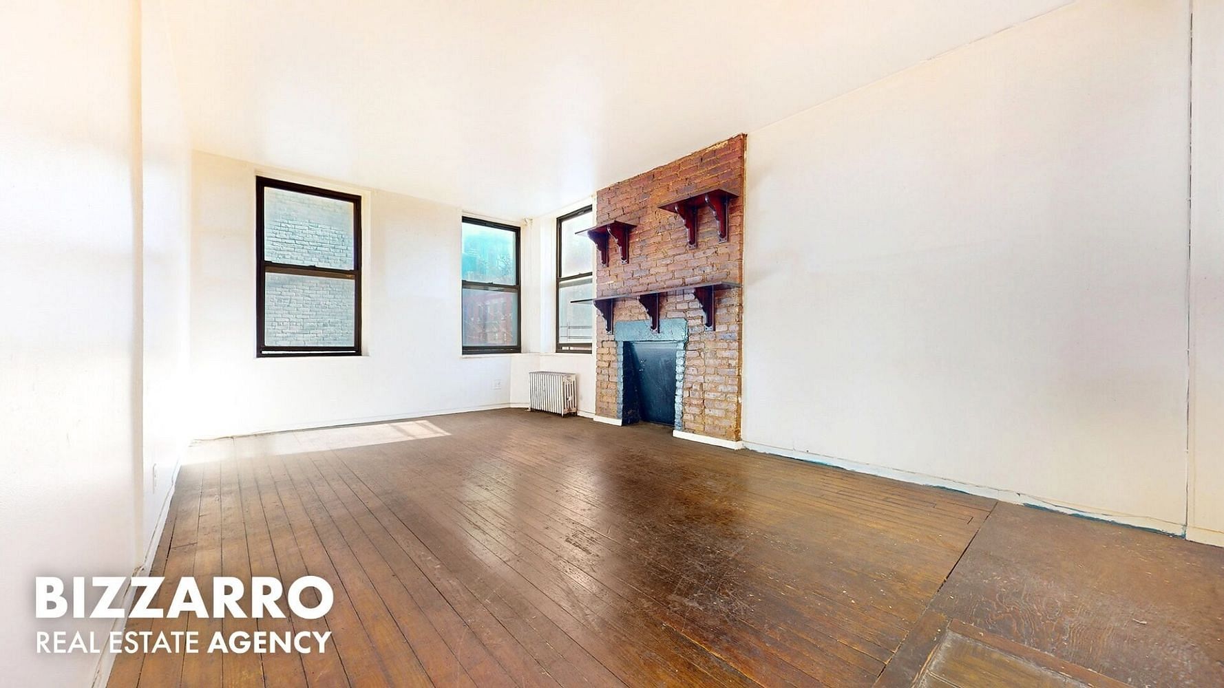 One of the great features is a huge light-filled living room with original wood floors, windows on two sides, and an exposed brick decorative fireplace. The kitchen is open to the living area and also has its own window. The bedrooms are quite large, and youll find cute vintage tiles in the bathroom.