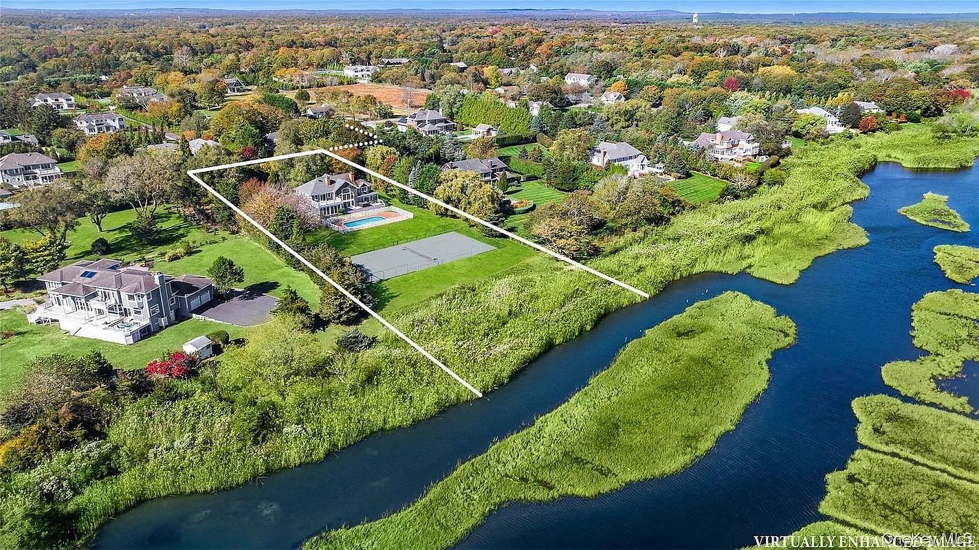 Set on +/- 2.01 acres south of the highway on Tanners Neck Creek in Westhampton, this post-modern residence, meticulously crafted by JP Spano, is set down a long, private driveway. Perfectly suited to enjoy the Hamptons lifestyle, this property is outfitted with all the amenities: heated, gunite pool, hot tub, play-gym, and Har-Tru tennis court. The front foyer opens to a bright and inviting living room with fireplace and cathedral ceiling. The chef's kitchen offers a center island with seating, Wolf and Sub Zero appliances, separate breakfast banquet, and expansive pantry/laundry/mud room adjacent to the attached two-car garage. The formal dining area overlooks the pool and back deck. A cozy den, home office, guest bedroom, full bathroom, and powder room complete the first floor. Upstairs, the gracious primary suite includes a walk-in cedar closet, en-suite with jacuzzi soaking tub, separate shower, and dual vanities, and a private balcony overlooking the well-manicured backyard. Two additional guest bedrooms, full bathroom, and bonus room complete the second floor. This Hamptons property is a short distance from Westhampton Beach's vibrant Main Street with boutique shopping, high-end restaurants, and world-class ocean beaches.