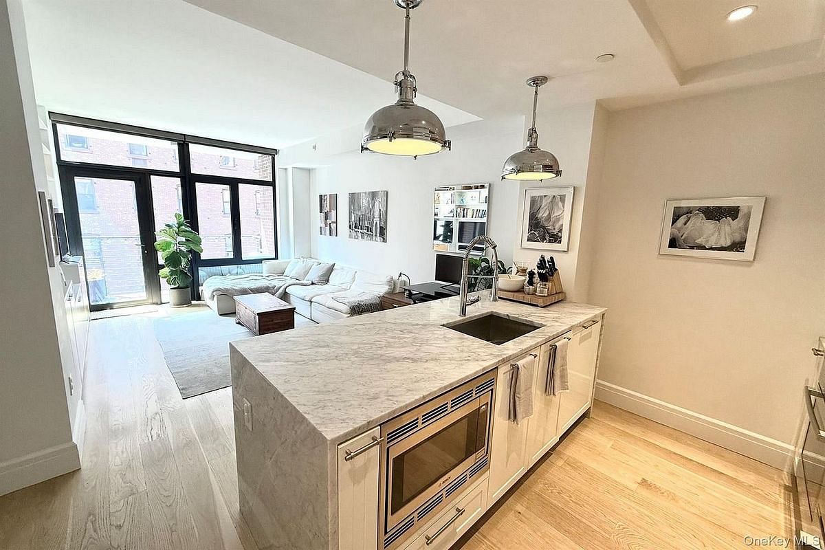 The unit features a chef's kitchen appointed with waterfall white Cararra marble countertops, custom walnut soft close drawers and cabinets, herringbone mosaic backsplash, Bosch Series appliances, and a Kohler stainless steel sink with Grohe pull out faucet and garbage disposal.