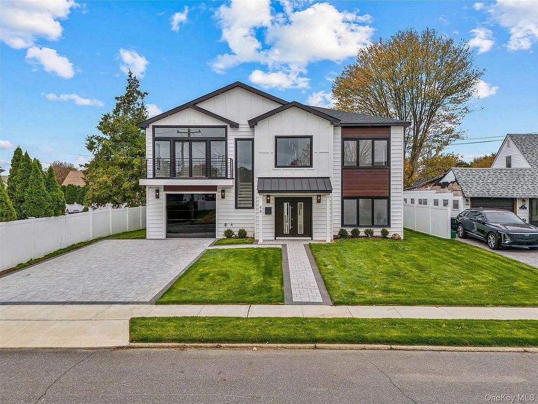 Welcome Home to This Brand-New Modern Masterpiece in the Heart of Salisbury! Nestled within East Meadow School District, this stunning new construction offers the perfect blend of comfort, luxury, and tranquility, crafted with a design that truly stands apart. Spanning 3,406 sq. ft., this modern home opens to a stunning two-story foyer, highlighted by a modern black steel staircase and expansive floor-to-ceiling windows that fill the space with abundant natural light. The European patio sliding glass doors extend the family living area, creating a bright, open space that seamlessly connects to the outdoor patio, perfect for effortless entertaining.