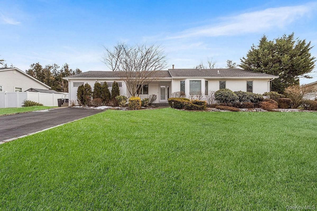 Welcome to this pristine ranch located in the award-winning Half Hollow Hills School District. This bright and inviting home offers an open-concept floor plan with spacious bedrooms, wood floors throughout, and a beautifully updated kitchen renovated within the past year. The eat-in kitchen features a comfortable breakfast nook, modern appliances and a sleek drawer microwave designed for efficient, contemporary living. Andersen windows throughout fill the home with natural light, creating a warm and welcoming atmosphere.