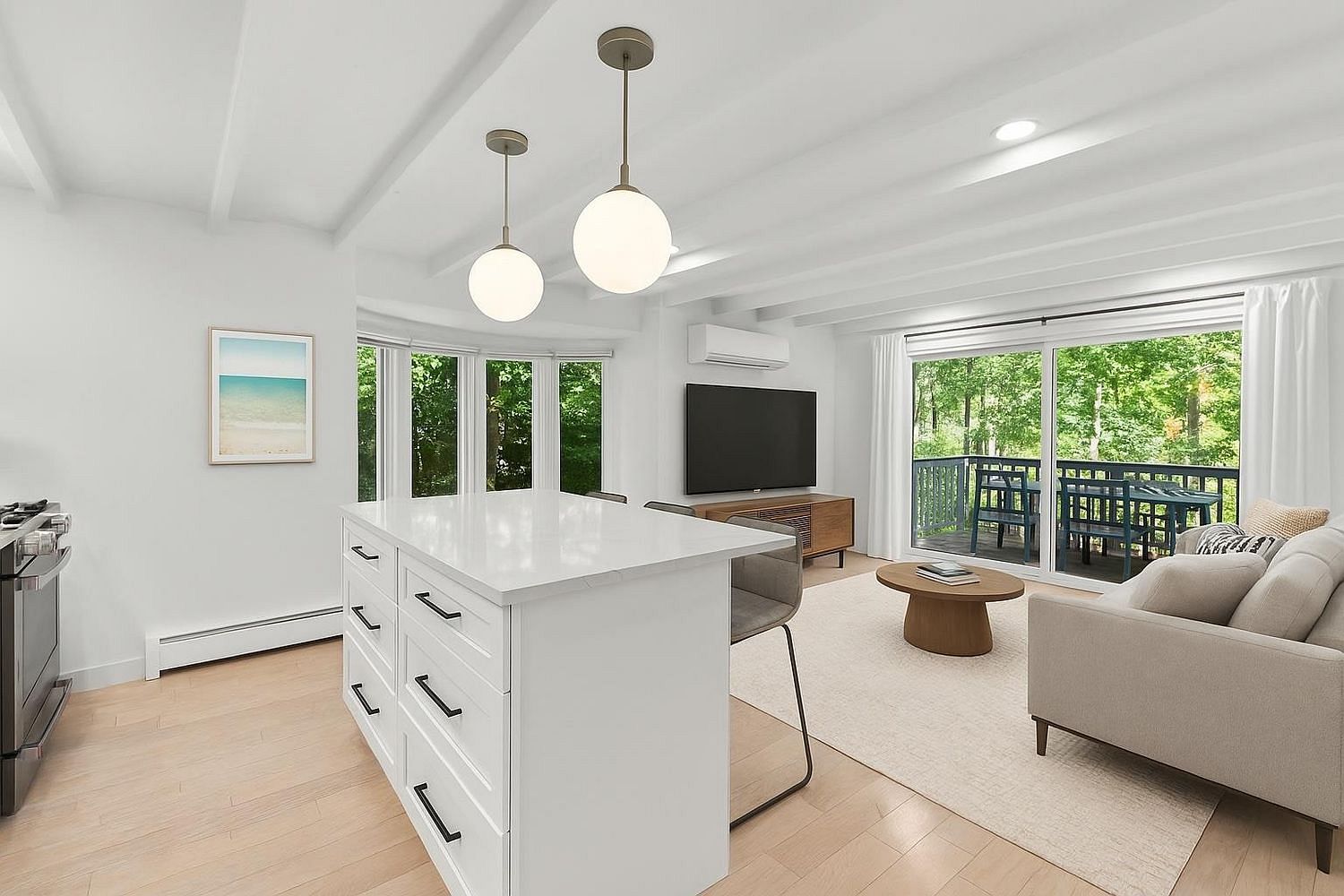 The open floor plan includes a living area that flows into a functional kitchen with energy-efficient appliances and quartz countertops. Interiors are finished with whitewashed walls, light wood floors, and a simple, minimal aesthetic.