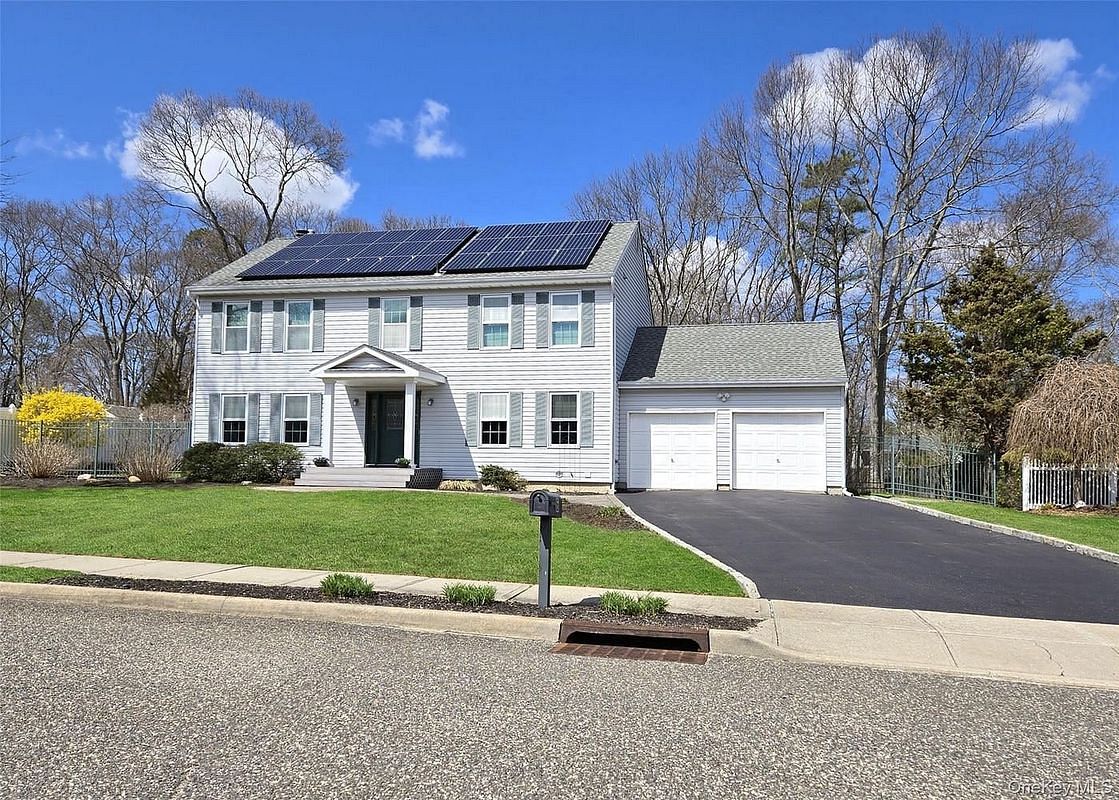 Just listed! Nestled in a quiet section of Holbrook, this spacious 4-bedroom, 3.5 bath home is set on a wide, peaceful street and offers a well-designed layout with quality construction throughout. Features include a 2-car garage with storage above, 2x6 construction, and excellent insulation. Interior highlights include wood flooring, crown molding, recessed lighting, triple pane windows, and a living room with a wood-burning fireplace. The living room offers a sliding door leading to a patio, perfect for indoor-outdoor living. The home is equipped with central air conditioning with 2 zones, gas heat with 3 zones, a hot water heater replaced in 2022, and fully paid/owned solar panels installed in 2015. Additional features include 150 amp electric service, an alarm system, a full attic, and in-ground sprinklers with 8 zones. The full finished basement offers additional living space and includes a full bathroom and an egress window. Step outside to enjoy a semi in-ground pool with a surrounding deck and a spacious yard. Conveniently located approximately 3 miles from the LIRR and near the Long Island Expressway, Sunrise Highway, MacArthur Airport, shopping, parks, restaurants, and schools. Located in the Sachem School District.