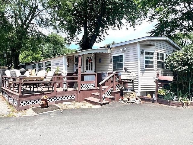 Spacious 2 bedroom mobile home located in the Bay Shore Park. This unit has many extras that others you will find in the park do not!! Comfortable eat in kitchen with southern exposure. Gas stove (propane). Double wide living room allows for seperate formal dining area or expanded living room. This unit also have TWO full bathrooms!!! One is located in the master bedroom that has a wall of custom built cabinets for plenty of storage. Large walk in, hallway closet has washer / dryer hookup. Enclosed patio / sunroom. Private fenced yard with shed. Driveway for one car. Large outdoor deck, perfect for entertaining. Oil heat. Buyer is purchasing unit. Land is leased through monthly park fee. Park fee includes taxes, water, sewer, garbage removal and snow removal of the main roads only. Affordable living at its finest. This park does allow for pets.