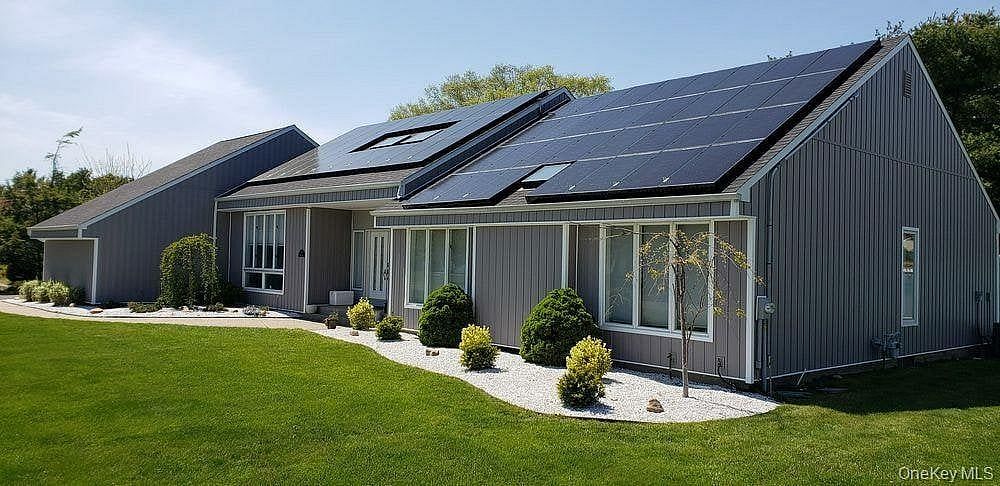 Beautifully updated center hall ranch in the Miller Farms section of Miller Place. Approximately 2900 sq ft plus semi-finished lower level with gym, sauna, and guest quarters. Huge 2900 sq ft basement. Cathedral ceilings up to 16 ft throughout most of the home. Features 3 bedrooms, 2.5 baths, bamboo hardwood floors, LED lighting, and dual-sided fireplace. Kitchen with Cambria quartz, 72" refrigerator/freezer, and custom coffee/wine station. Primary suite opens to deck with sunken hot tub. Exterior updates include newer roof, siding, furnace, hot-water heater, and 2-zone central AC. Newer heated saltwater inground pool with approx. 1,900 sq ft of pavers, Bull outdoor kitchen, greenhouse, and raised garden beds. New double-width driveway (2024), 11-zone sprinklers, solar system, universal EV charger, video security, and vinyl-fenced yard. Minutes to Trader Joe's, Starbucks, Stop & Shop, and North Shore beaches. Truly a turn-key luxury home.
