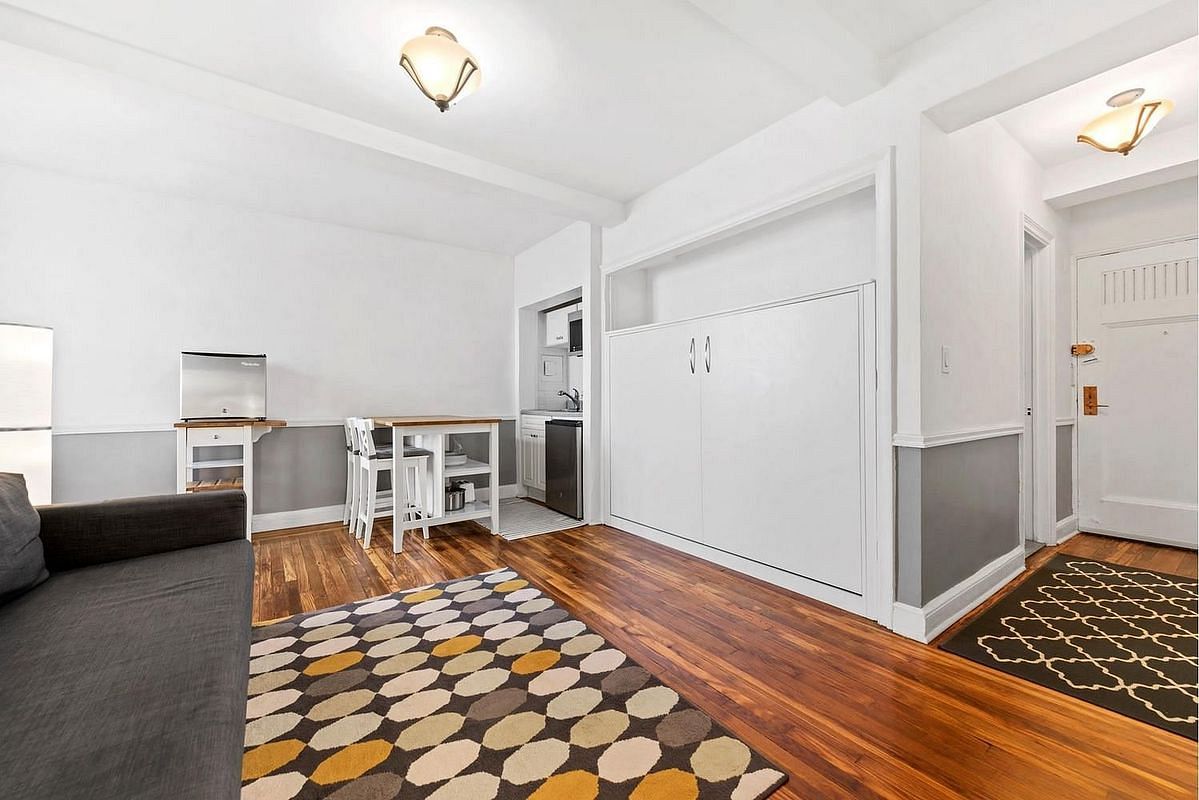 Nice cozy & charming studio facing East River in Tudor City building. Custom made super comfy Murphy full size bed makes great use of space, easy to accommodate large sofa and dinning area. Beautiful hardwood floors, 3 spacious closets. Wonderful location, close to shopping, Grand Central and NYC subways but far from city traffic and noise. One block from 42nd St. crosstown. Beautiful City Park for relaxation. Building has 2000 sq ft gym has river views, laundry facility, on site 24 hour super and maintenance staff, and an in-house deli/supermarket.