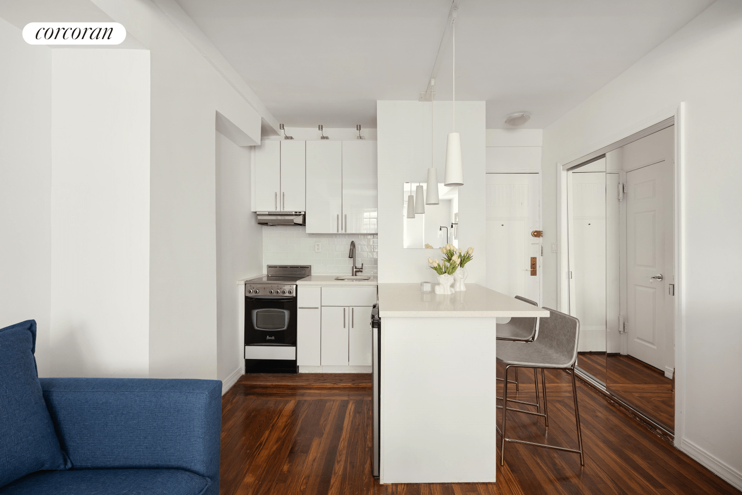 Residence 1806 is a tastefully renovated, high floor studio at Windsor Tower. The renovated full kitchen features a custom island with barstool seating, granite countertops, glass tile backsplash, sleek white cabinetry, a four-burner electric stovetop, microwave oven and an under-the-counter refrigerator. With an incredibly functional layout, this studio offers 2 closets, a spacious updated bathroom with Italian tiles, and refinished original hardwood flooring throughout. Tastefully decorated, this home can be delivered fully-furnished for an additional fee. Low monthly maintenance includes water, heat AND ELECTRIC!