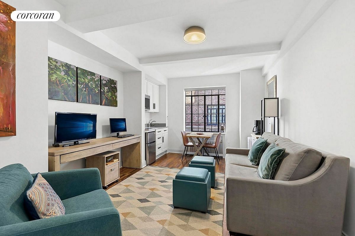 5 Tudor City Place #1910 is a study in design practicality with no space wasted and it feels light and airy with its large windows. You will not want for storage with both a walk-in and utility closet at hand. The kitchen appliances include a compact refrigerator, overhead microwave, lots of cabinet space, quartz countertop and a cafe-style dining area with a coffee bar to perk you up each morning. There is also an alcove that is perfect for a Murphy bed and enough space to work-from-home as well. The bathroom is tastefully finished and with plenty of storage. You will love living in this pin-drop quiet apartment, suffused with natural light and tranquility. Best of all, 5 Tudor City Place #1910 has one of the lowest carrying costs of any apartment in Tudor City.