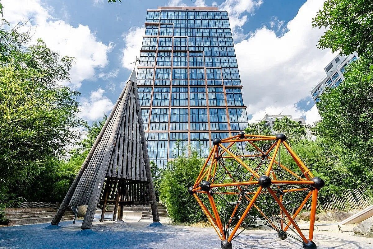 Rooftop Sunset Lounge & Sky Cabana with BBQs & fireplaces • 2,500 SF gym • Children’s playroom • Music room with piano • Pet wash • 24/7 concierge • Private & bike storage