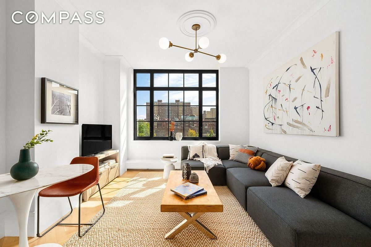 A galley foyer flows directly into the bright and sunny living room. Natural light bathes the interior through a large east facing industrial style casement window that frames the dynamic LES landscape. The open kitchen features an impressive 8 honed white marble island with unique mirrored sides, textured charcoal granite countertops and backsplash, floor-to-ceiling espresso-stained oak cabinetry with brushed bronze hardware, and a full suite of high-end appliances including a Bosch dishwasher, integrated Sharp microwave, 30 Wolf oven and gas cooktop, and a 30 Sub-Zero refrigerator with dual-drawer freezer.