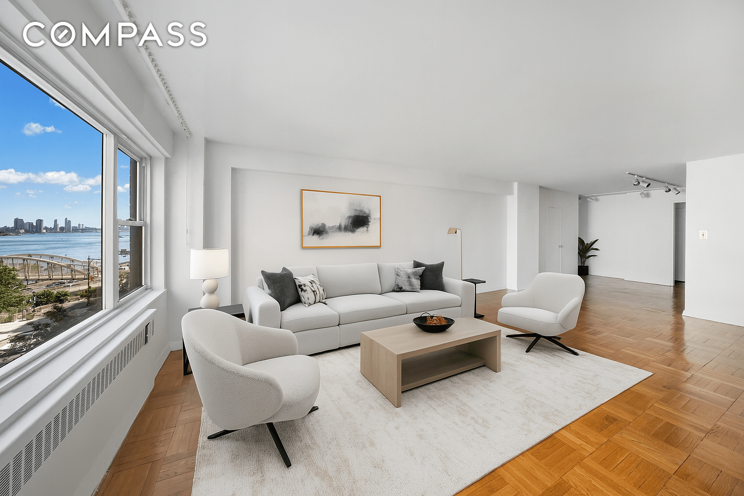 Upon entry, youre greeted by a generous foyer with a large walk-in closet, perfect for coats, storage, or pantry use. The expansive living room is bathed in natural light from oversized windows, with beautiful river views that extend to a private terrace a perfect spot for morning coffee or evening relaxation.