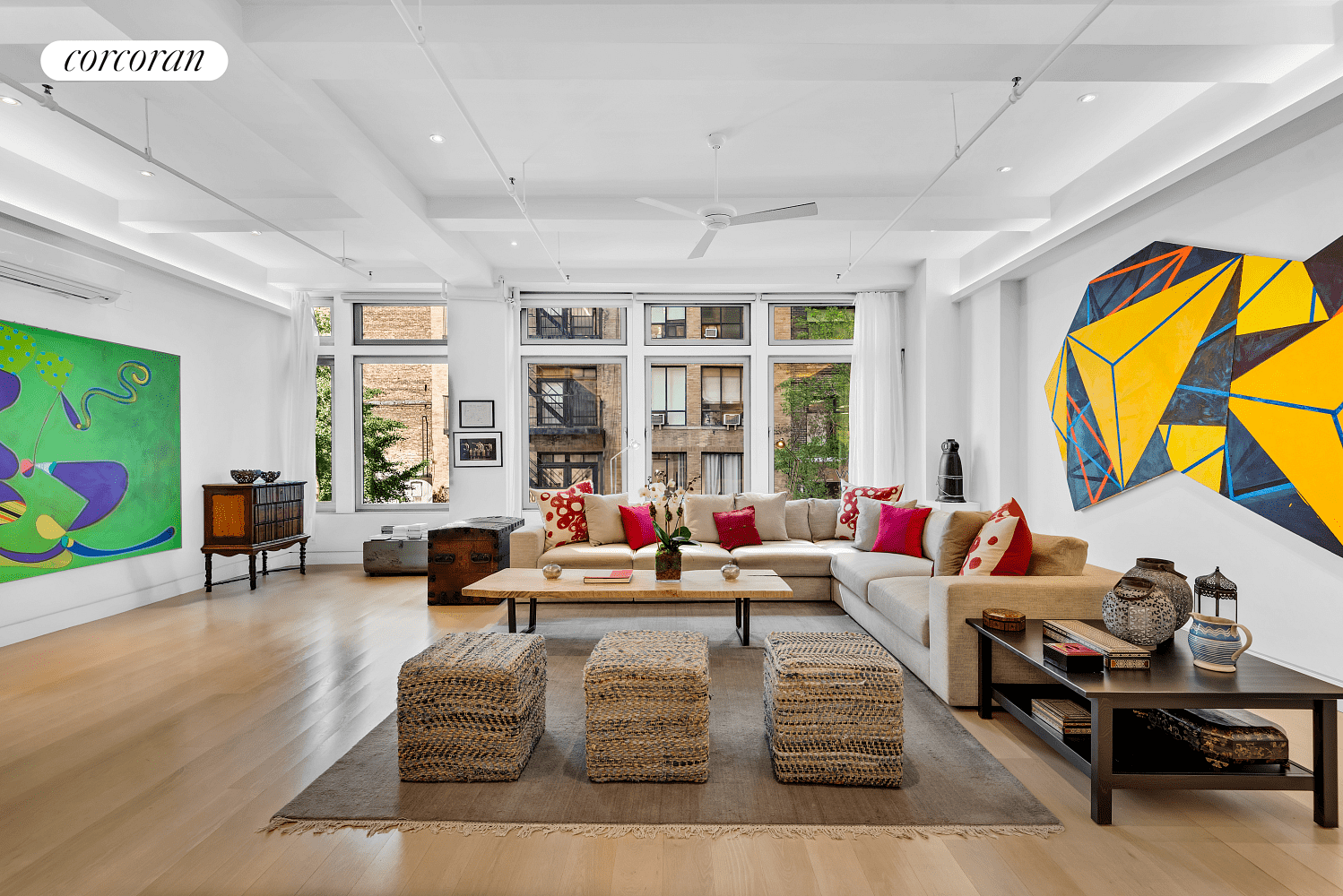 This meticulously renovated artist's luxury loft at 50 West 29th Street in the heart of NoMad, Manhattan, offers 2,366 square feet of adaptable living space, perfect for modern urban living. The layout is designed to be highly adaptable, allowing for one or two bedrooms, with the flexibility to create a third bedroom within the expansive living area.