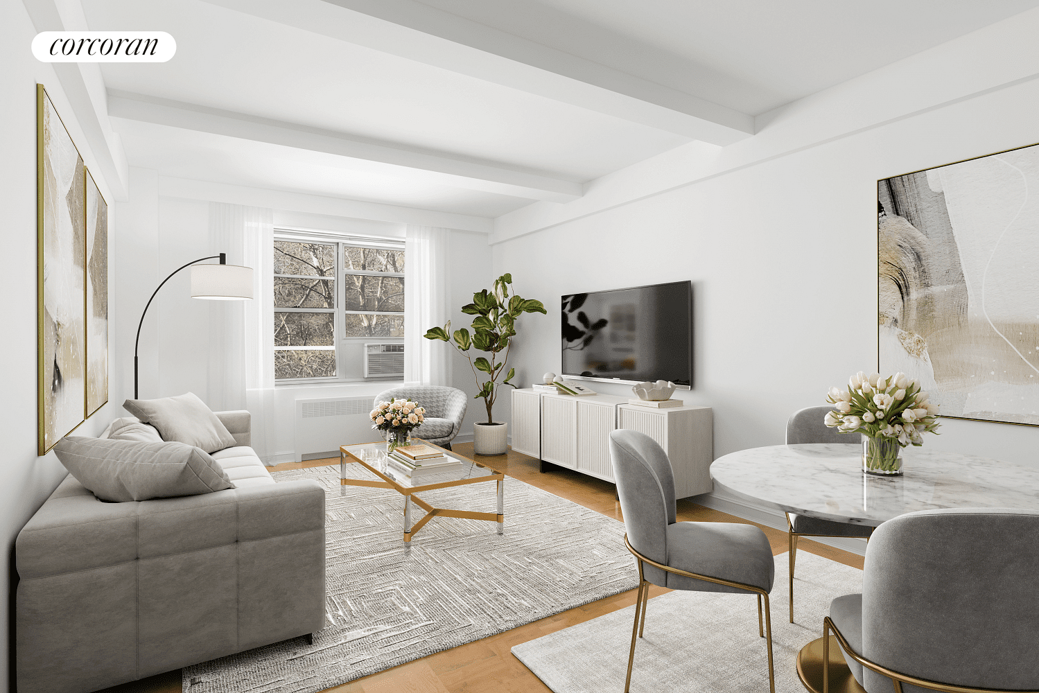 This spacious, sunlit, and beautifully proportioned one-bedroom easily converts into a two-bedroom or home office setup. It's bright and airy with natural light and northern and western exposures. Special features include a king-sized bedroom, lovely treetop views, excellent storage and closets, and gorgeously refinished hardwood floors. The sun-filled, windowed eat-in kitchen is spacious and functional, featuring generous cabinetry and large counter space. A fully renovated, windowed bathroom adds a modern and clean feel.