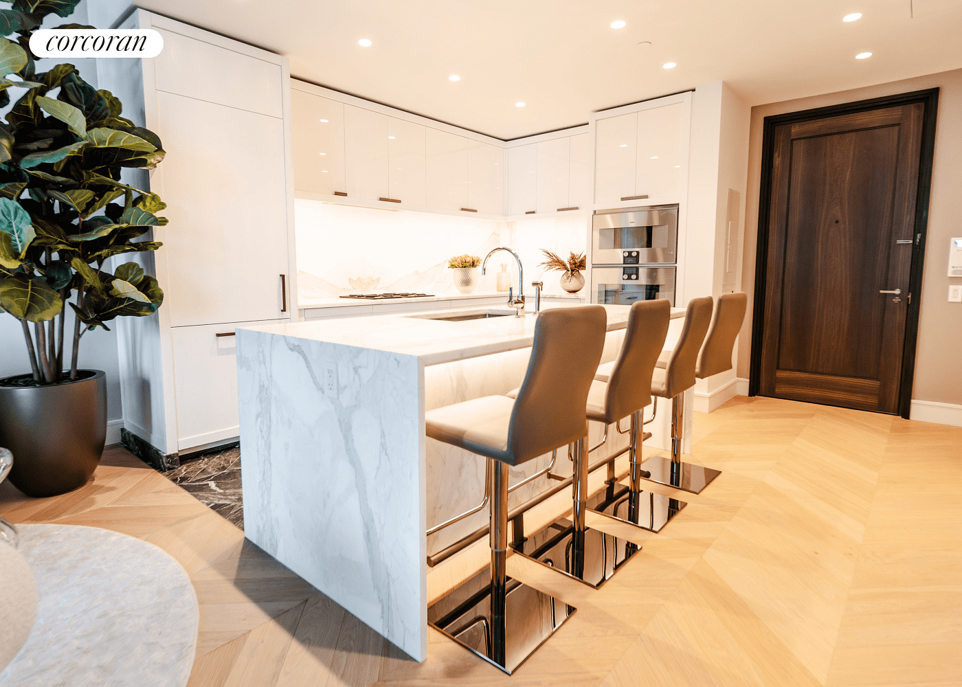 East 17C at One High Line is a 1,181SF one-bedroom and one-and-a-half-bathroom residence curated by Gilles & Boissier, boasting expansive city views above the famed High Line from every room. The home's generous great room is equipped with elegant oak chevron floors, blending seamlessly with the open kitchen designed by Molteni, complete with Calacatta Gold Marble countertops and backsplash, Carnico Grigio floor and accents, a robust Gaggenau appliance package and stainless-steel fixtures by THG.