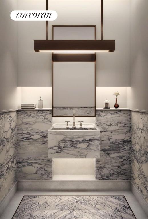 East 23E is equipped with a signature powder room adorned in Calacatta Paonazzo, ample storage and closet space, premium stacked washer-dryer and a state-of-the-art home automation system by Kraus Hi-Tech.
