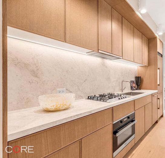 The kitchens exhibit culinary artistry, featuring custom-designed oak cabinetry, pristine white marble countertops, and backsplashes with subtle grey veining, beautifully integrated with state-of-the-art Miele appliances. A stainless-steel sink with Kohler fixtures in a titanium finish and an in-sink garbage disposal add to the kitchen's elegance and practicality.