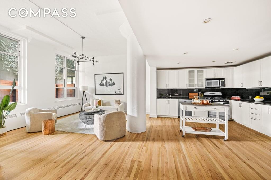 The open concept living, dining, and kitchen is an expansive loft-like space that could offer many unique layouts. You will be taken aback by the homes light and bright natural hardwood floors - just refinished before coming to market, oversized windows, high ceilings, and an original old candy factory column. The renovated oversized L-shaped kitchen offers custom crisp white cabinetry, granite counters and backsplash, Bosch dishwasher, GE gas stove and microwave, and Samsung French door refrigerator. The kitchen is parallel to a generous dining area that could easily accommodate a 12-person dining table and buffet or console. Imagine the dinner parties you could host!