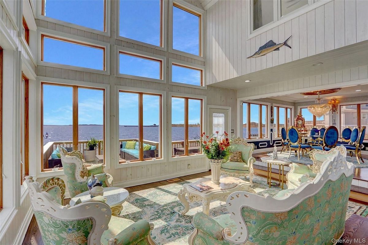 Waterfront Luxury meets architectural brilliance on the Great South Bay! This stunning 5-bedroom, 4935sq ft estate is a one-of-a-kind masterpiece featuring sleek design, panoramic water views, boat slip and 122ft of new bulkhead and docking for all your toys. With an expansive Rooftop Deck, wall to wall windows, Chef's kitchen and luxe en-suites set on its own private peninsula with nearly one acre of land, this is an exceptional property for boaters, fishing enthusiasts and anyone seeking a waterfront retreat! Inside, soaring walls of windows in the living room, family room and dining room frame breathtaking panoramic water views. A Sleek bar in the living/dining area adds a touch of refined indulgence for entertaining. The spacious chef's kitchen features a large center island with prep sink, Thermador appliances, including two full refrigerator freezers, a built in coffee bar, and sleek custom finishes.