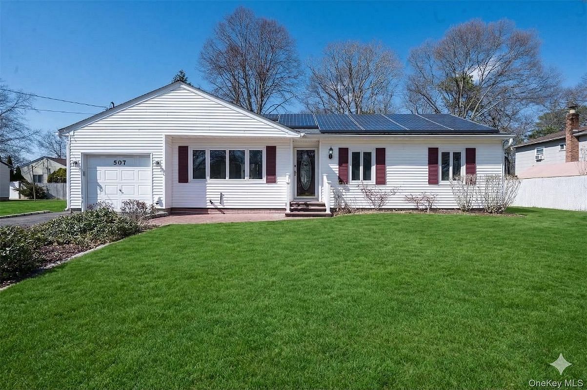 Pristine Ranch on Quiet Dead-End Block Discover this impeccably maintained, sun-drenched home perfectly situated on a peaceful dead-end street. Freshly painted and move-in ready, this home offers a clean slate for your personal touch. The west-facing, bright living room and formal dining room feature beautifully finished hardwood floors leading to the sunken den with sliding doors to a large paved patio and parklike grounds. The main level also includes an eat-in kitchen, 3 comfortable bedrooms, a full bath, and a bonus room ideal for a home office. Additional features include a full basement with utilities/laundry, attic storage, new carpeting in the den & bedrooms, Anderson windows throughout, and Central Air Conditioning. The 0.24-acre property is meticulously kept with an inground sprinkler system and cost-saving leased solar panels (easily transferable). With an Unbeatable Location, enjoy privacy without sacrificing convenience. Moments away from the LIRR Ronkonkoma Station, MacArthur Airport, and the new Station Yards development. Nature lovers will appreciate the proximity to Lake Ronkonkoma County Park. Located in the Connetquot Central School District. A rare find with true pride of ownership!