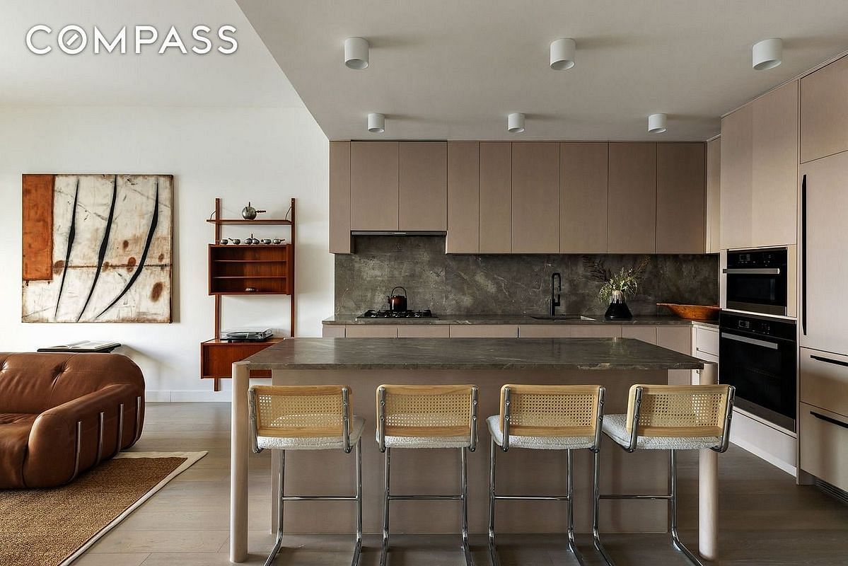 The apartment opens into a bright, open living and dining area, ideal for both everyday living and entertaining. Oversized windows frame the skyline and enhance the airy proportions of the space. The contemporary kitchen is anchored by a generous island and features honed Grigio Pearl marble countertops that were sealed by TuffSkin for seameless use. The kitchen also includes custom cabinetry, and a fully integrated suite of premium Miele appliances. The island works perfectly as a dining alternative or as additional entertaining space.