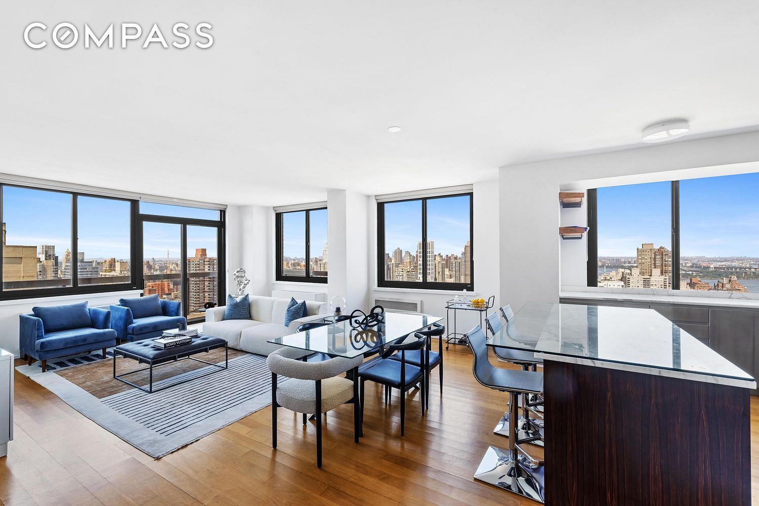 With 10 foot ceiling heights, and located just beneath the penthouse level, this 1,669-square-foot showplace makes a dramatic first impression with walls of windows capturing unimpeded outlooks to the west and north. A gracious foyer flanked by a coat closet and chic powder room introduces the home's wide-plank natural walnut floors and tall ceilings. Ahead, the nearly 31-foot-long corner living/dining room invites you to relax and entertain surrounded by a wraparound balcony and views that stretch from cotton candy sunsets and iconic Midtown skyscrapers to the East River, Roosevelt Island, The Bronx, Queens and beyond. Elevate your culinary expertise in the sleek open kitchen adorned with ebony Macassar cabinetry, Calacatta Gold marble countertops and Dornbracht hardware. The upscale appliances include a Bosch five-burner cooktop and oven, a Sub-Zero refrigerator, a Miele Incognito dishwasher and a Viking convection microwave.