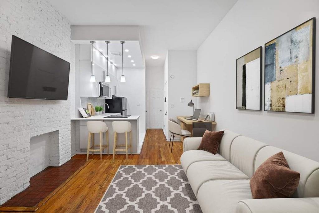 The first floor of the home features a newly renovated open concept high-end kitchen with a dishwasher, built in microwave and an electric range. The first floor also boosts charming exposed brick, a decorative fireplace, high ceiling, through wall air conditioning and a newly renovated full bathroom and a bedroom.